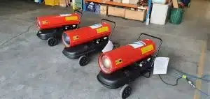 A diesel fan heater is perfect for heating up large industrial spaces. These rental diesel heaters provide an instant, effective and reliable source of heat and can be put in exactly the right spot for the job. On wheels and with their own fuel tank, it makes them the ideal heating appliance in situations such as these. Just be sure to top that 56L fuel tank up once a day, but otherwise it can be left to run and heat the space. All heaters should be in a clear area, with nothing touching the heater itself or within a 1 metre radius of the heater.