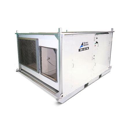 The 90 kW rental air conditioner operating in conditions from -7 to 42 degrees, the 90kW package unit is a fully self contained, reverse cycle unit that is quiet in operation and powerful in air delivery. The unique status lamp on the external face of the unit allows easy monitoring. Unit footprint: 3110mm x 2380mm.